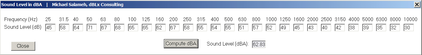 -dBA calculation: Calculation of the sound level in dBA from one-third octave band levels in dB.